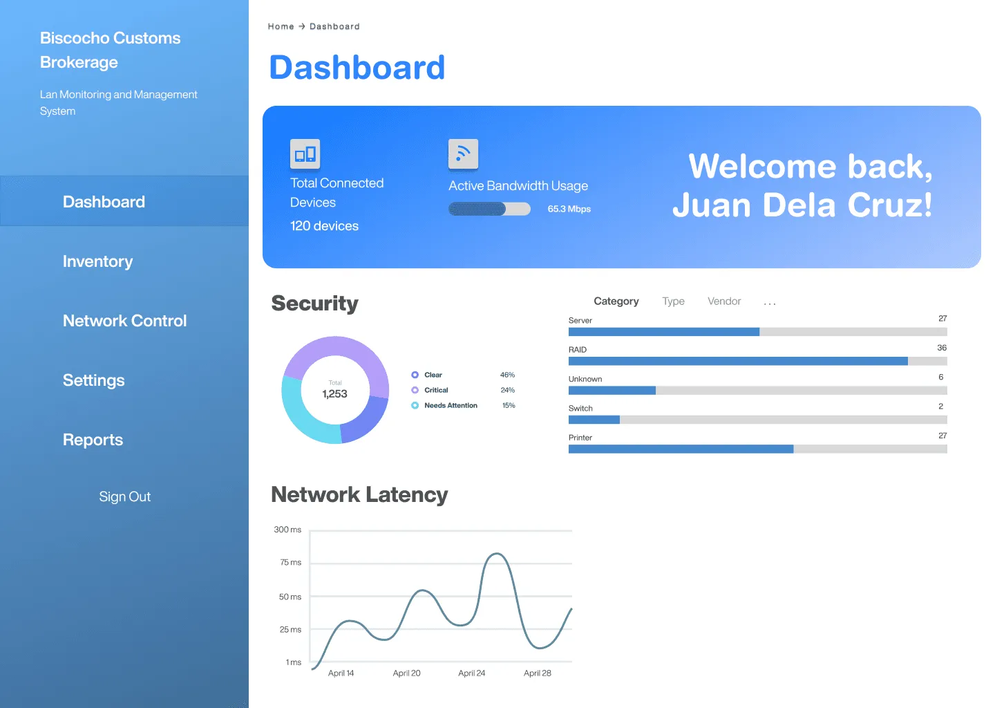 This project features a commissioned UI/UX design for a LAN Monitoring and Management System, created as part of a capstone project. I approached this work with a strong focus on clarity and functionality, aiming to design an experience that would feel intuitive and efficient for users navigating a highly technical platform.